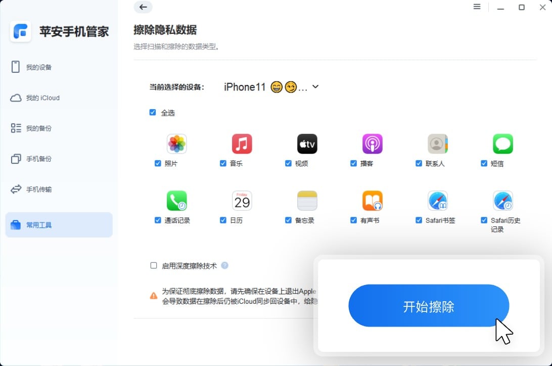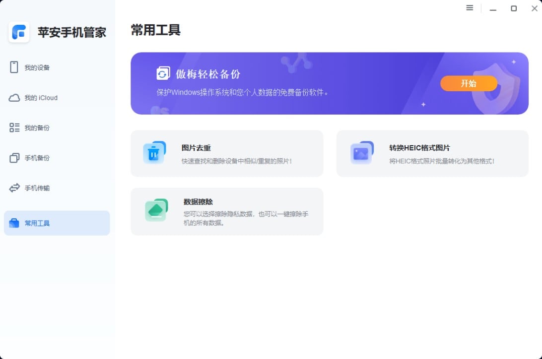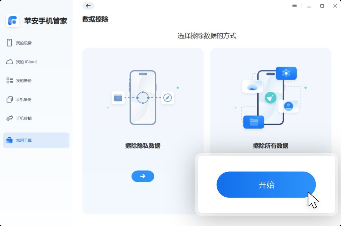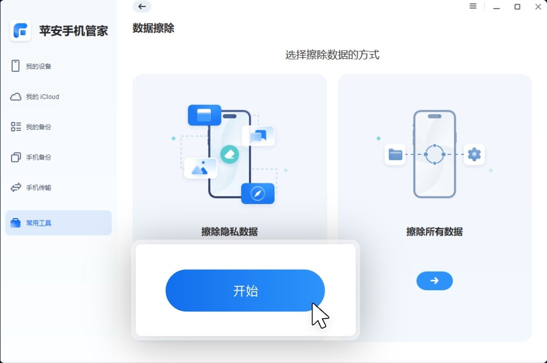 将手机连接到电脑,打开苹安手机管家,点击“常用工具”>“数据擦除”。