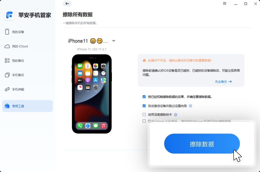 苹安手机管家适应各种需求。例如,您可以选择将iPhone恢复出厂设置或完全擦除数据,并决定删除后是否保留Apple ID。