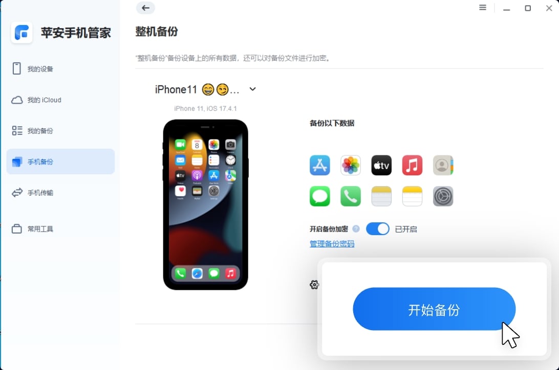 点击“开始备份”将数据从iPhone备份到电脑。