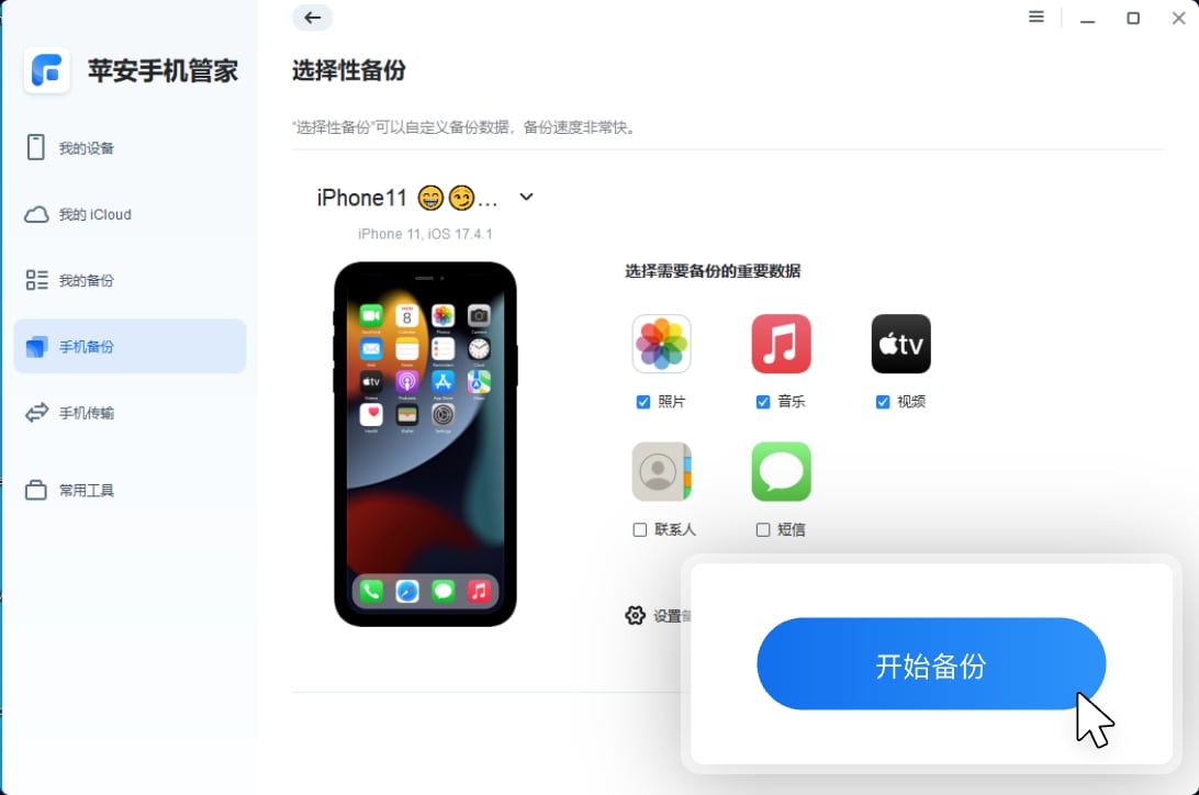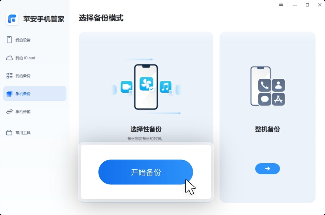 打开苹安手机管家,单击手机备份 -> 选择性备份 -> 开始备份。