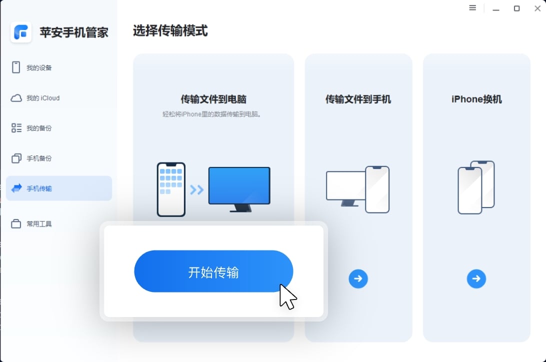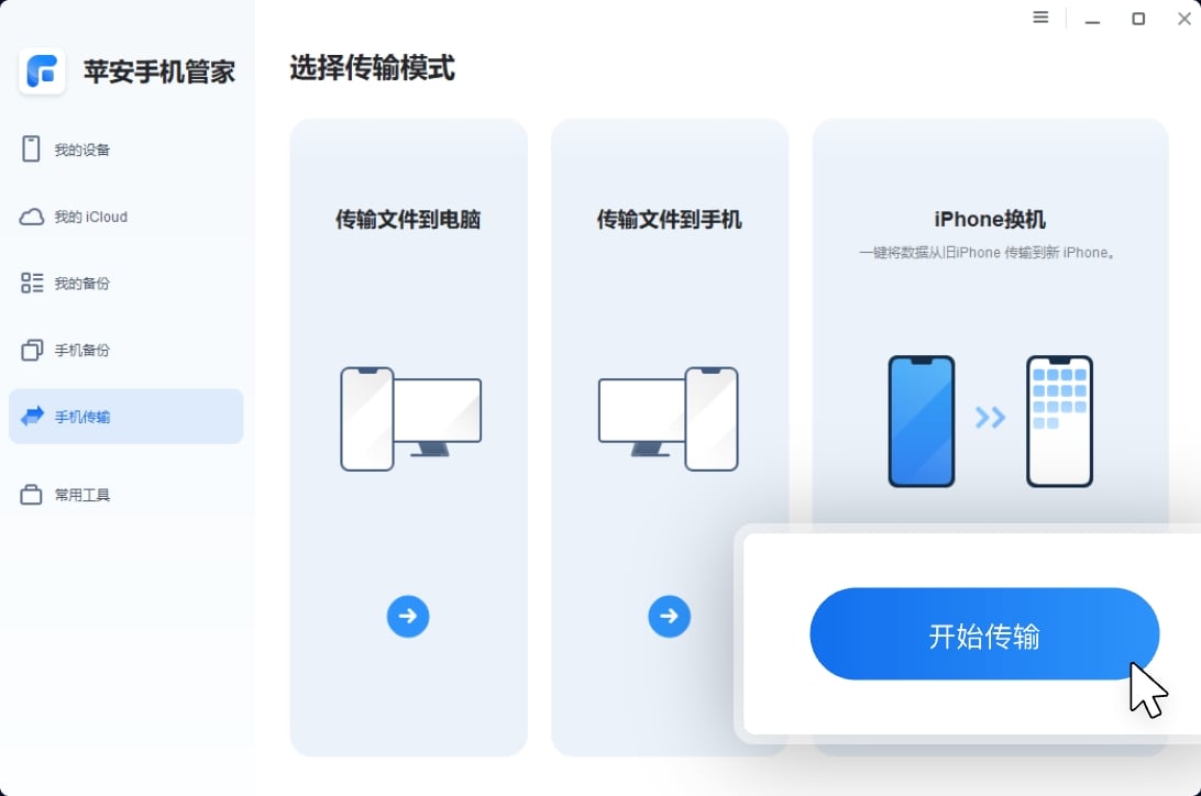 启动苹安手机管家,然后单击手机传输-> iPhone换机-> 开始传输。