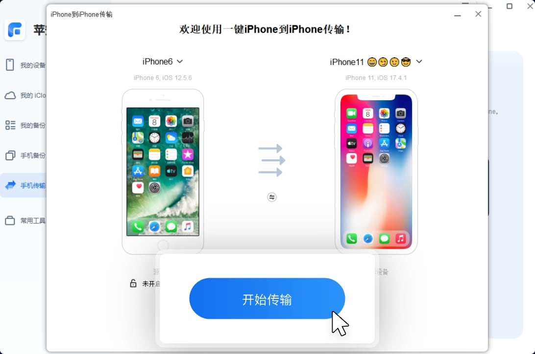 确认源设备和目标设备。单击“开始传输”将数据传输到新iPhone。