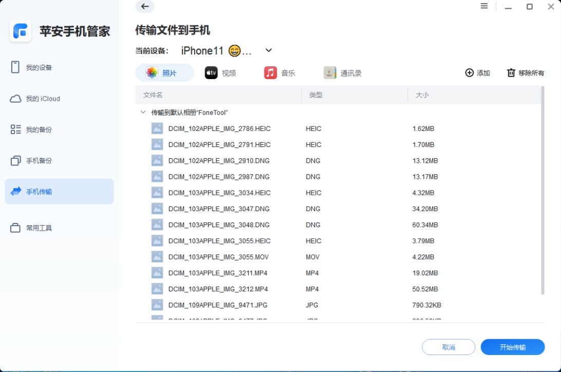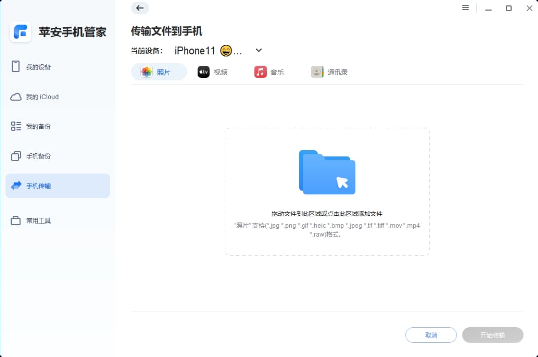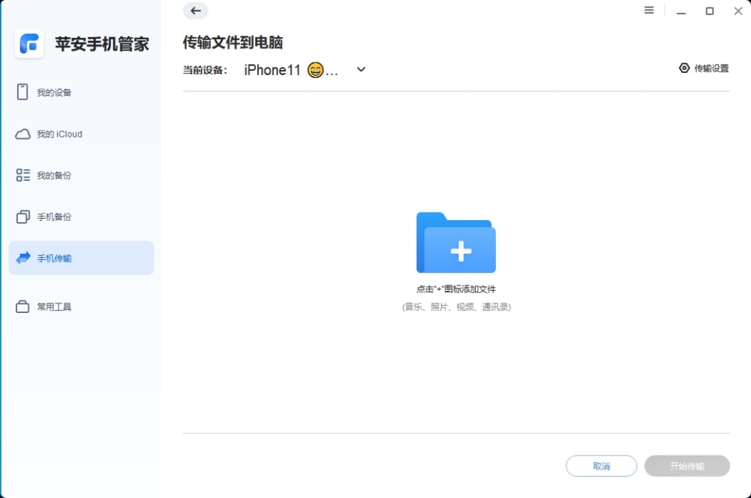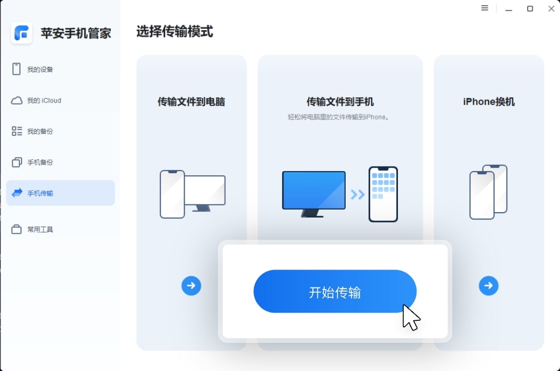 启动苹安手机管家,然后单击手机传输-> 传输文件到手机-> 开始传输。