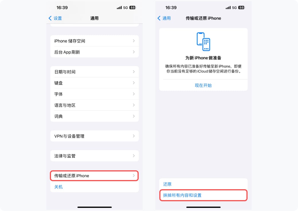 如果您不小心拒绝了“快速启动”,则需要转到“设置”并选择“抹掉所有内容和设置”以重新启动“快速启动”。如果您不想丢失当前新iPhone的设置,您可以选择使用iTunes或更简单的苹安手机管家将iPhone数据移动到新iPhone。