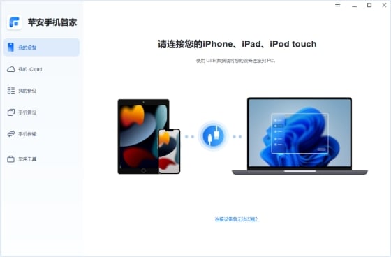 启动电脑上的苹安手机管家,并将您的两部iPhone连接到电脑。