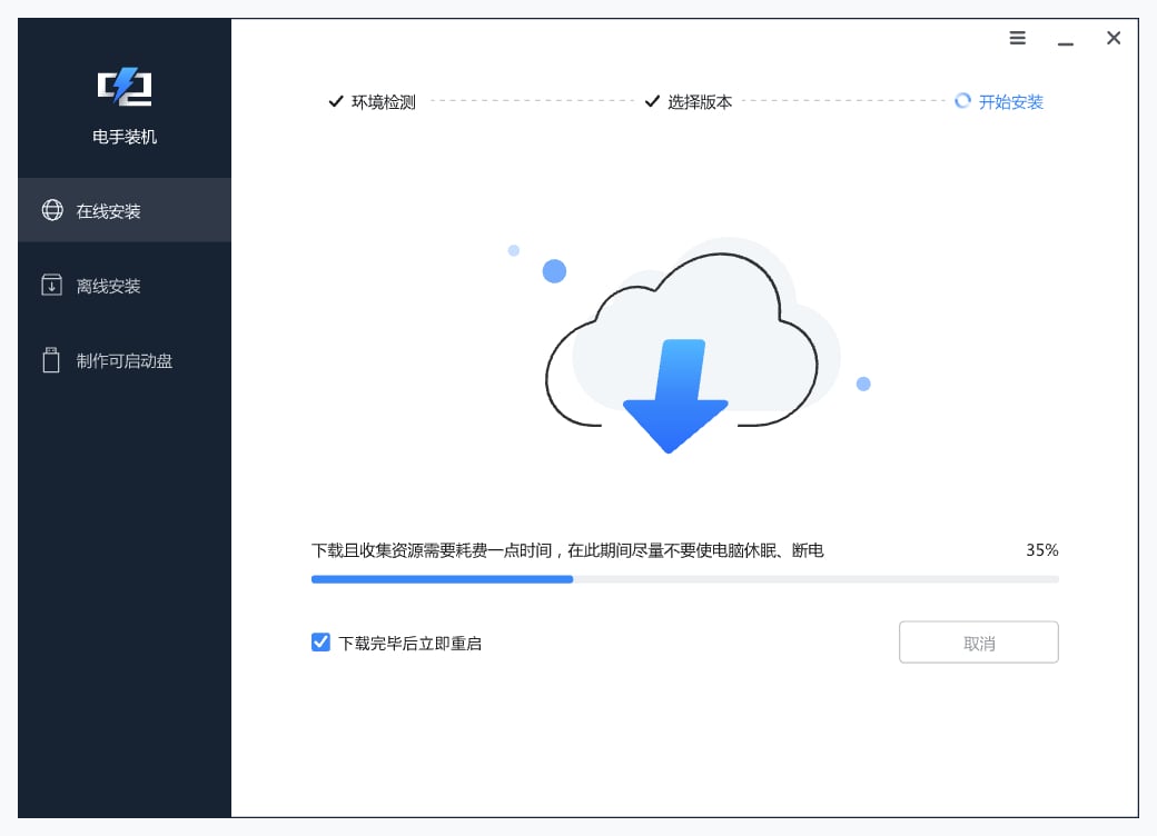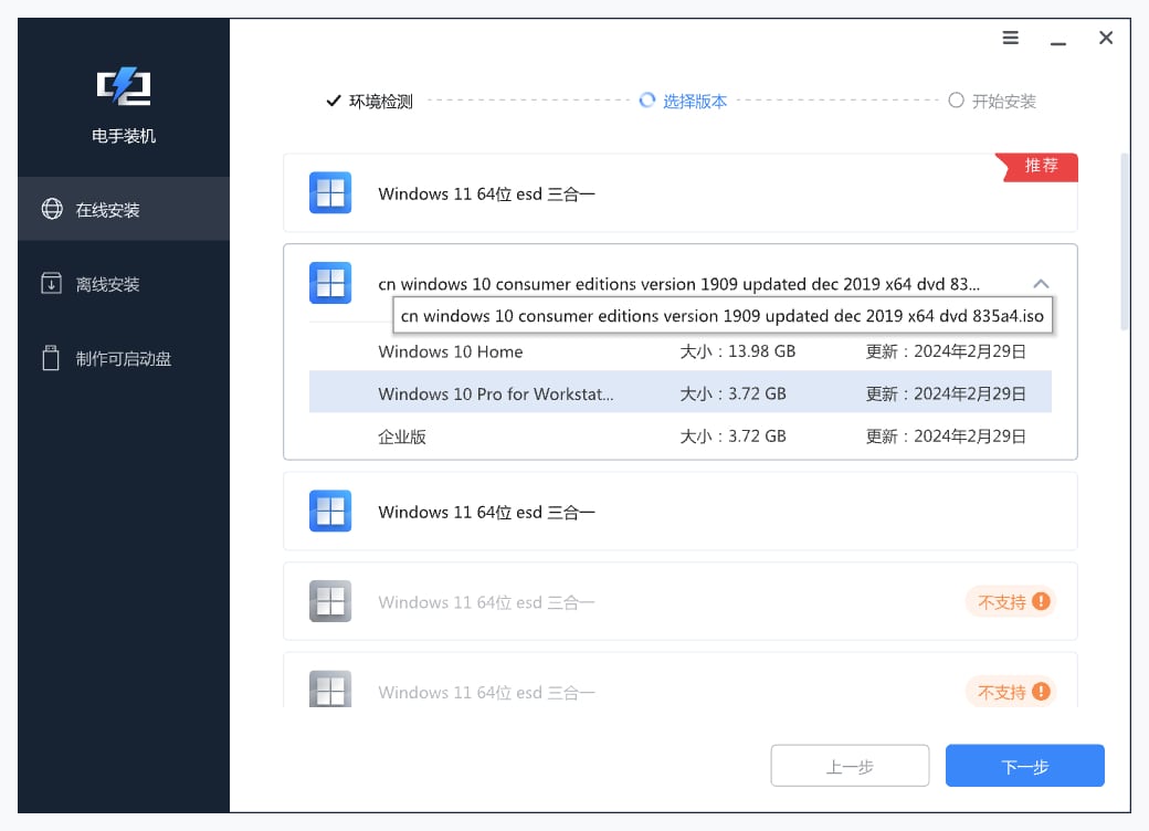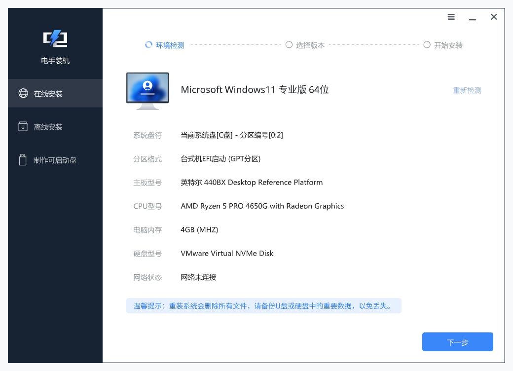 下载安装好软件后打开软件,点击软件左侧的"在线安装"选项,然后点击“下一步”开始“环境检测”。