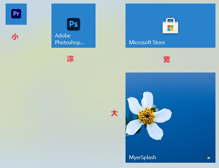 右键磁贴可以选择大小,桌面程序只有 小、中两个选项,UWP 程序有小、中、宽、大四个选项。