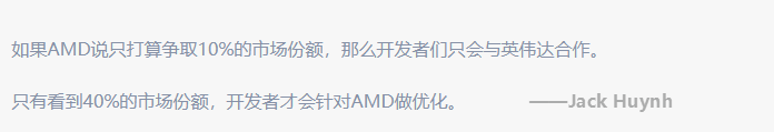 而后来的 intel 和紧随其后的 AMD 刚刚有点动作,就被 NVIDIA 40 系一脚大油门远远的甩在了身后。看着 NVIDIA 从怀里掏出来的外星科技,AMD 自知再硬碰硬也竞争不过,当下就表示下代不再更新旗舰,专注于中低端市场耕耘。