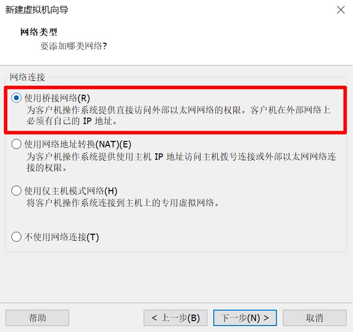 虚拟机网络一定选择“桥接模式”,这样本地物理网卡和虚拟网卡将通过VMnet0虚拟交换机进行桥接,物理网卡和虚拟网卡就相当于处于同一个网段。