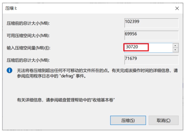 3. 在“输入压缩空间量”中,输入想要的大小,建议至少30GB(30720MB)以上,深度系统需要至少16G的空间。