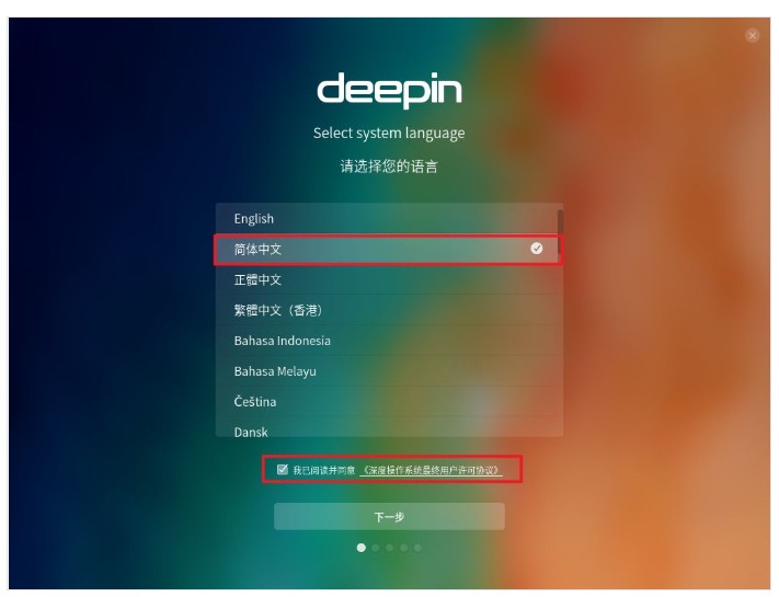 安装步骤第一步是选择语言,按照下图的方式选择“中文”,勾选用户许可协议,后点击下一步。