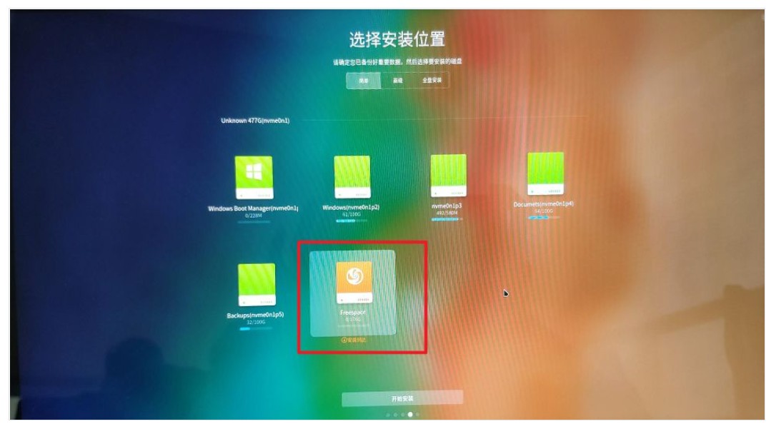 鼠标点击上一个步骤创建的未分配空间(FreeSpace),注意不要选择到了其他分区,以免导致数据丢失。点击开始安装。