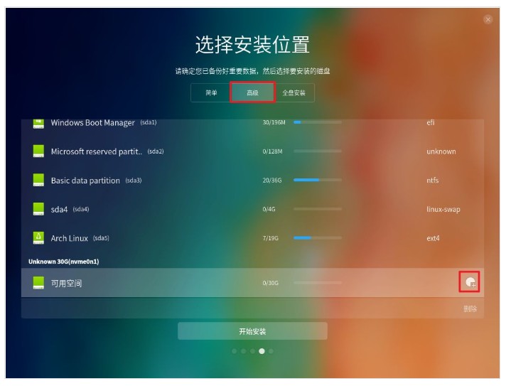 如果你需要手动创建分区,比如 分为“/” “/home” 和 swap三个分区, 那么就可以使用高级模式。高级模式的使用方法,其实和上一篇小编介绍的安装Arch Linux 分区的方式加上了一个GUI界面,也很简单。