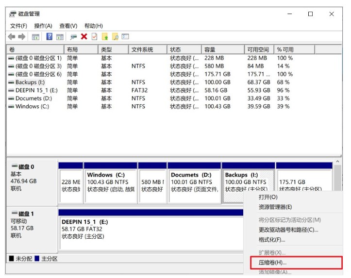 2. 通过压缩现有的分区空间,可以获取未分配空间,右键一个分区,该分区有足够的空间可以压缩,点击“压缩卷”。